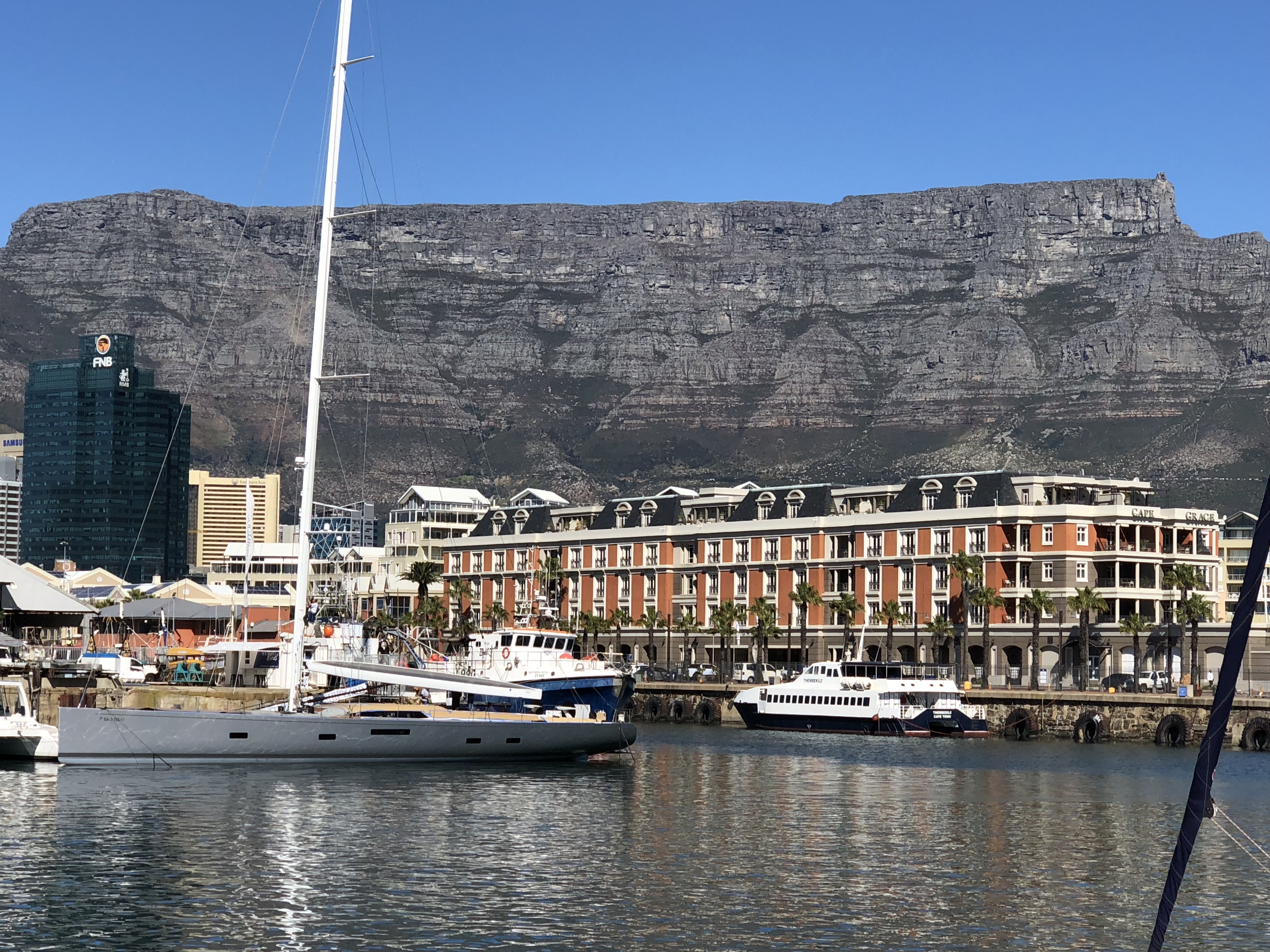 We are staying at the Cape Grace hotel which is backed by the famous Tabletop Mountain on one side and the active community waterfront/marina on the other. A perfect blend of location, luxury, history and great hotel service.