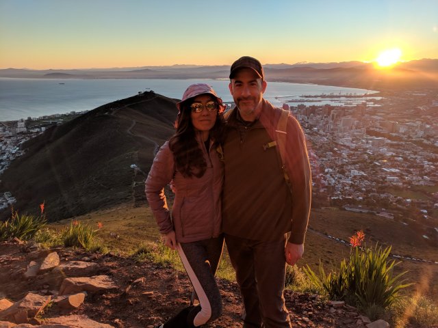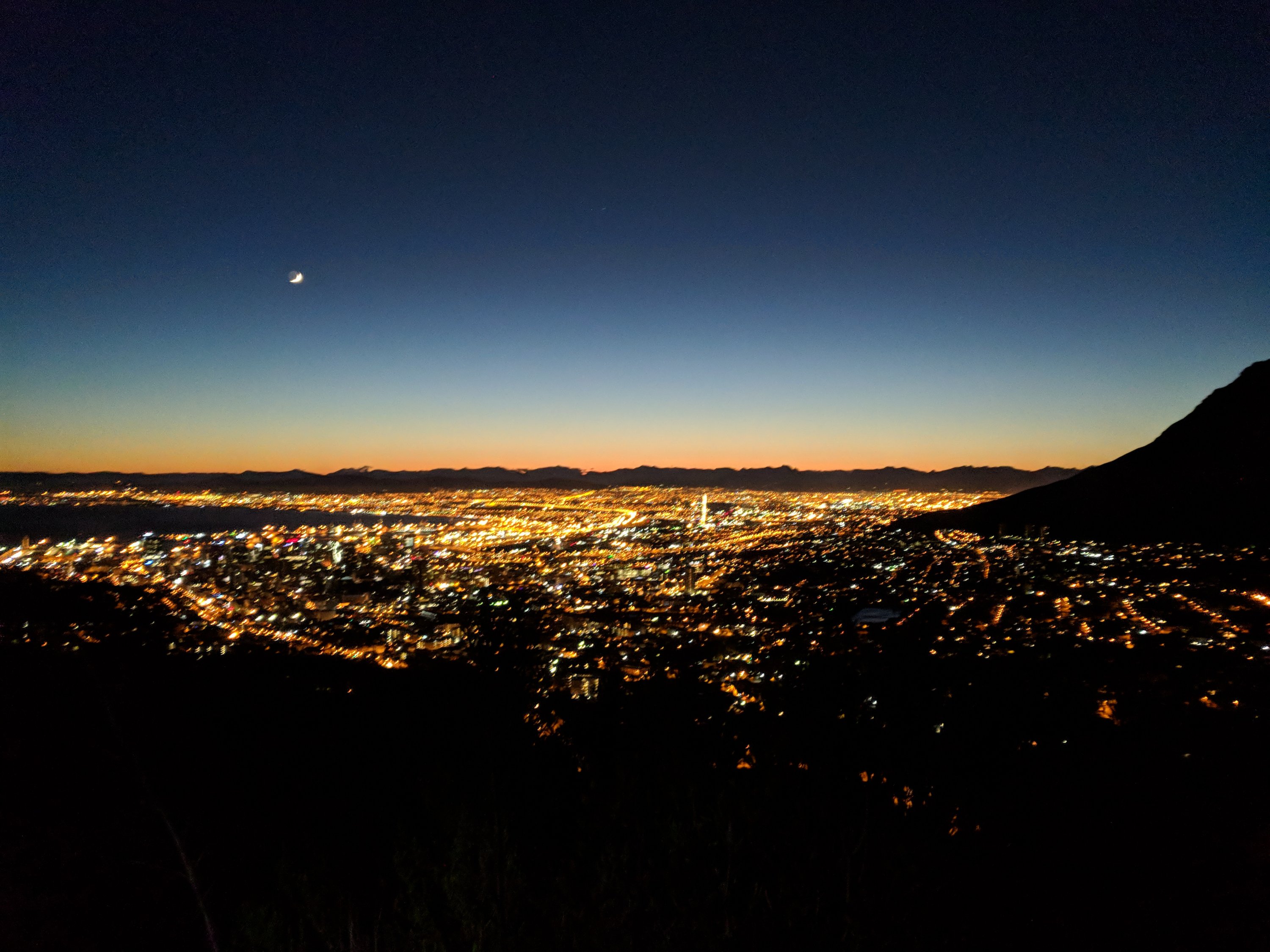 Now the weather in South Africa and Cape Town can be quite variable in the winter months, so when you have good weather, what do you take advantage of? Go hiking early in the morning in the mountains before the sun rises! This shot is a nice view of the city when we were about half way up the Lion’s Head peak with the crescent moon still up on the sky.